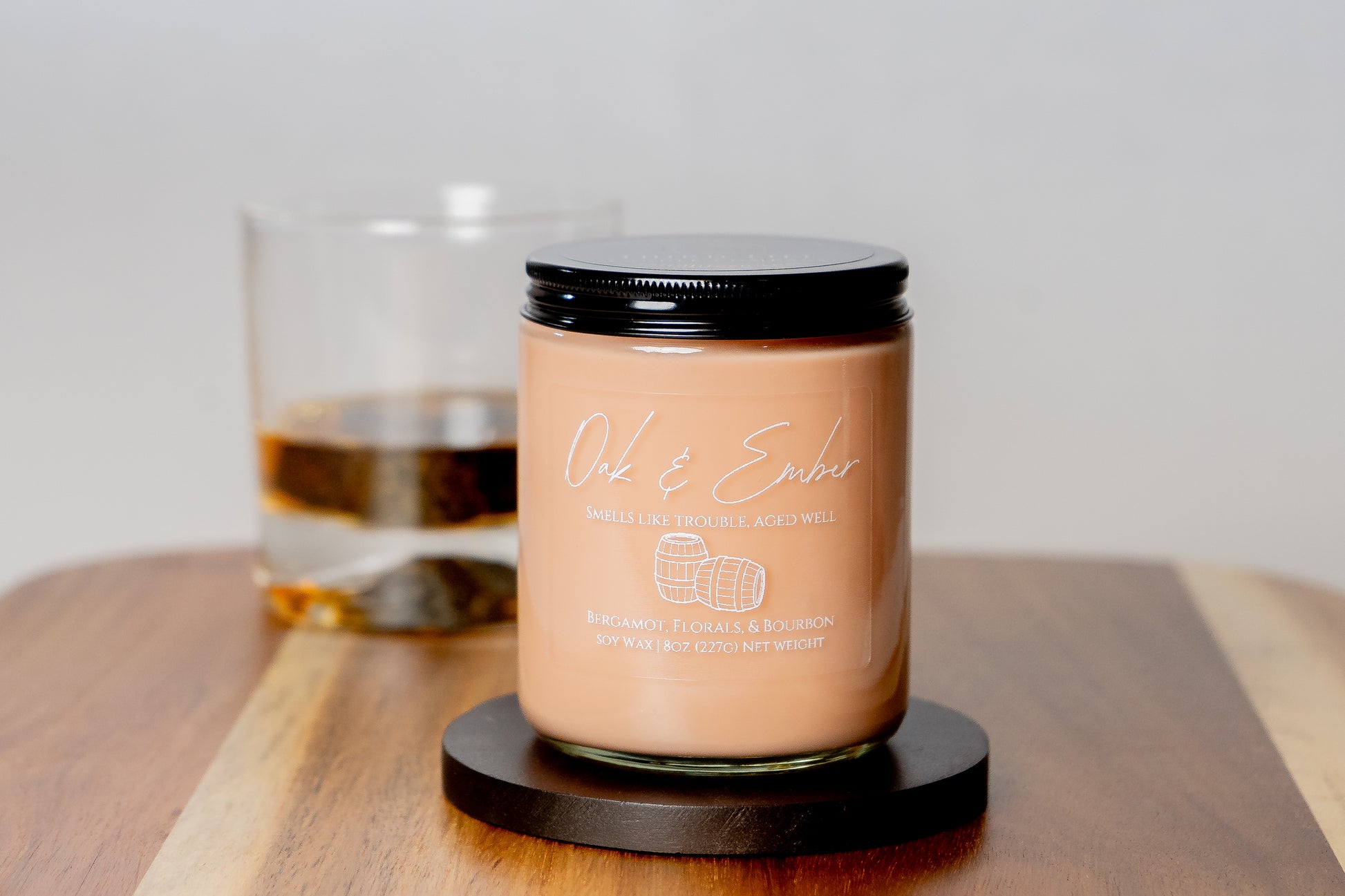 Oak & Ember is a slow burn of bourbon and charm — where rugged woods meet a smooth pour. Notes of bergamot and cedar leaf spark the flame, soft florals whisper through the haze, and rich bourbon and musk linger long after the lights go down. It’s warmth, wit, and just a little wicked — for those who like their evenings neat and their candles bold.